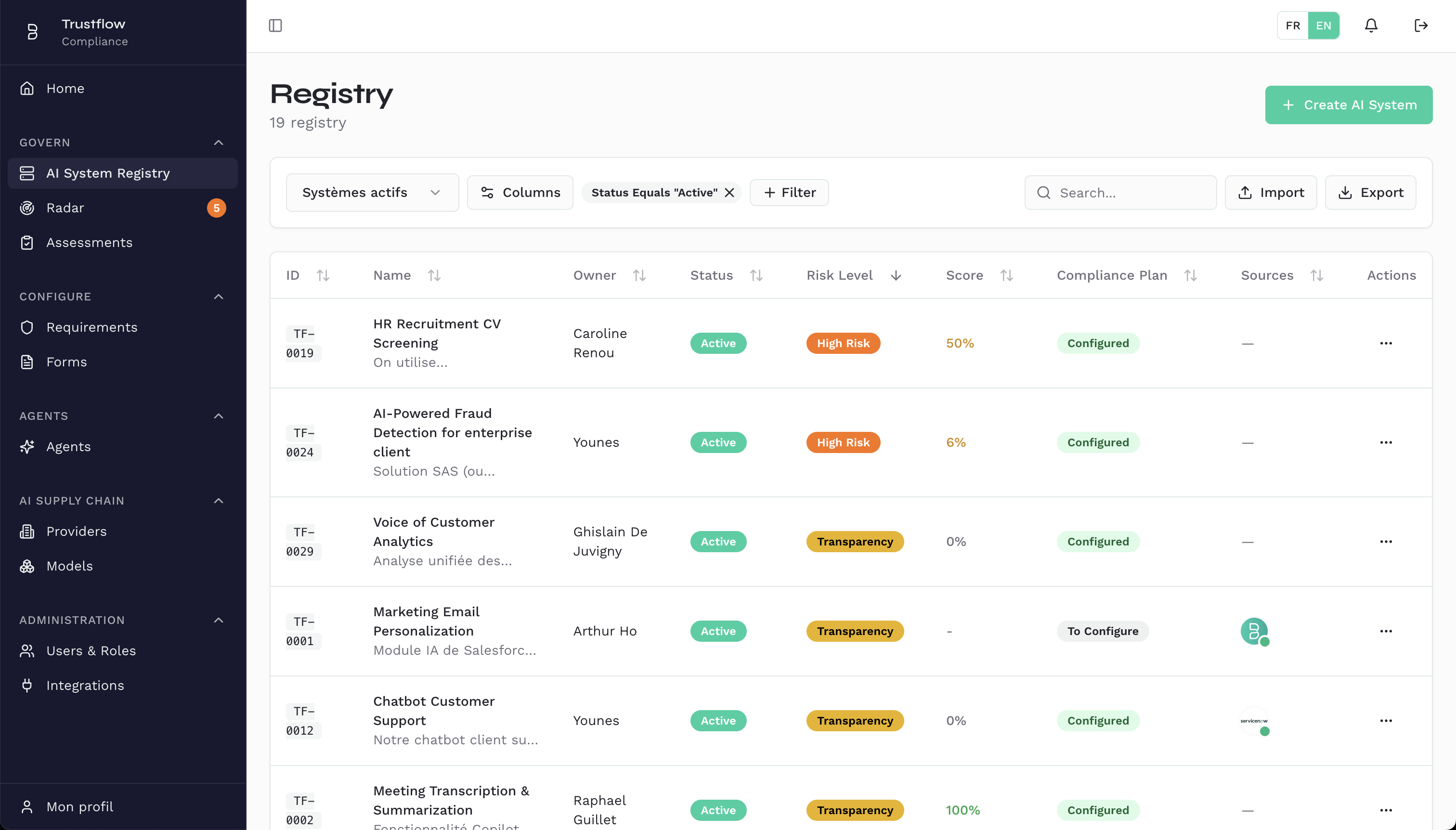 Inventoriez et cartographiez tous vos systèmes IA dans un registre unique. Classifiez par niveau de risque selon l'EU AI Act.